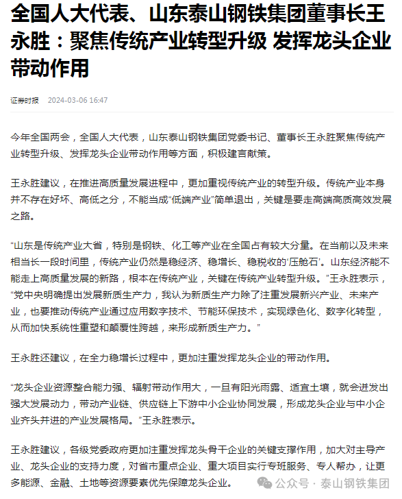 不能把传统产业当成“低端产业”简单退出,而是要通过转型升级走好高端高质高效发展之路。王董事长的“泰钢方案”被《人民日报》《中国青年报》《证券时报》《大众日报》《上海证券报》等多家媒体报道、转载。